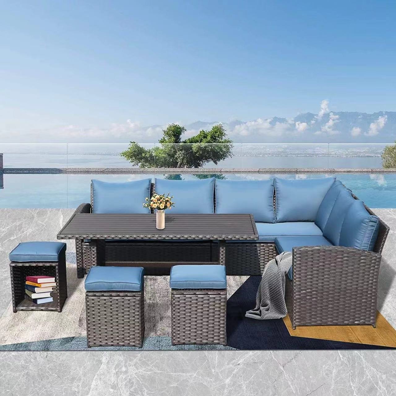 8 Seats Outdoor Sofa Dining Set Wicker Patio Sectional Set with Dining Table