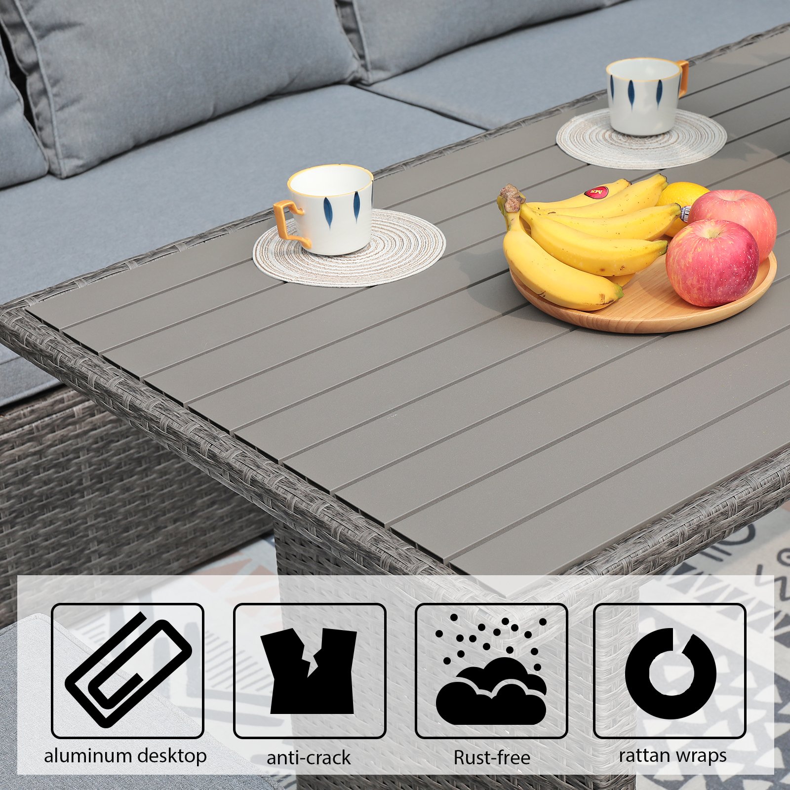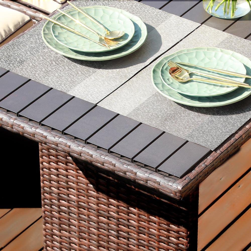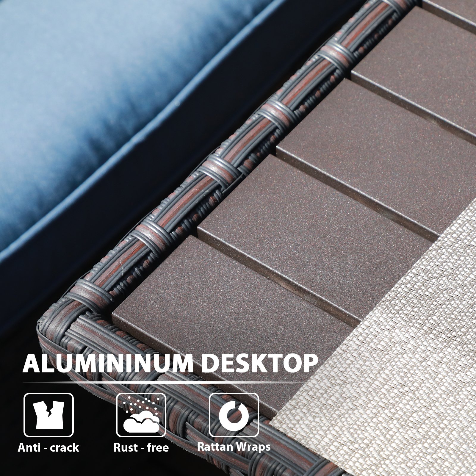 - Easy Maintenance The resin rattan surface and the aluminum top of the table are both easy to clean with a wet cloth, worry-free from the stain of beverage or sauce on it.