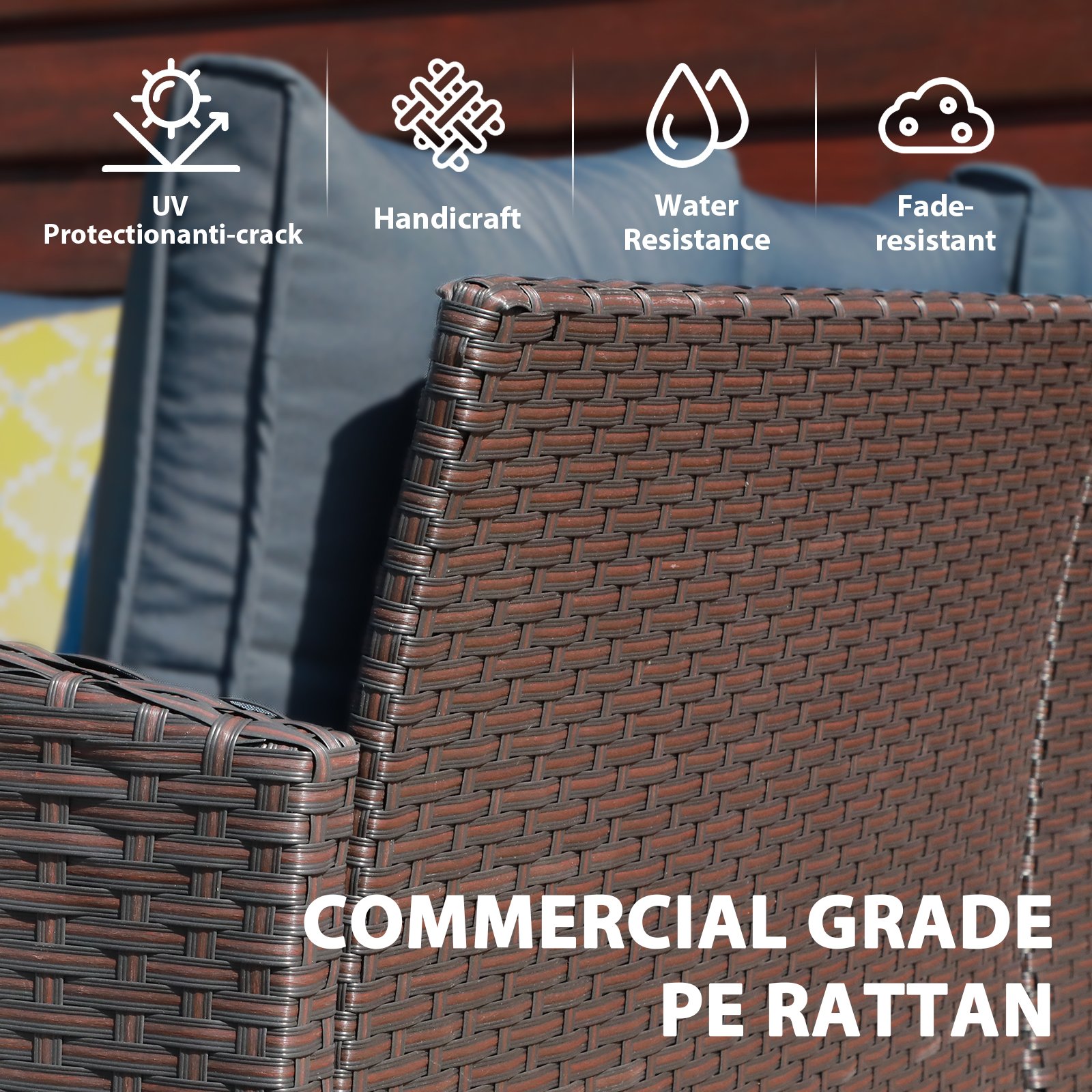 Handwoven and Premium RattanFeaturing with a powder-coated steel frame, UV and all-weather resistant PE resin rattan wicker, durable yet lightweight, which makes it easy to carry and move, this wicker patio furniture set is designed to ensure a long service life. |