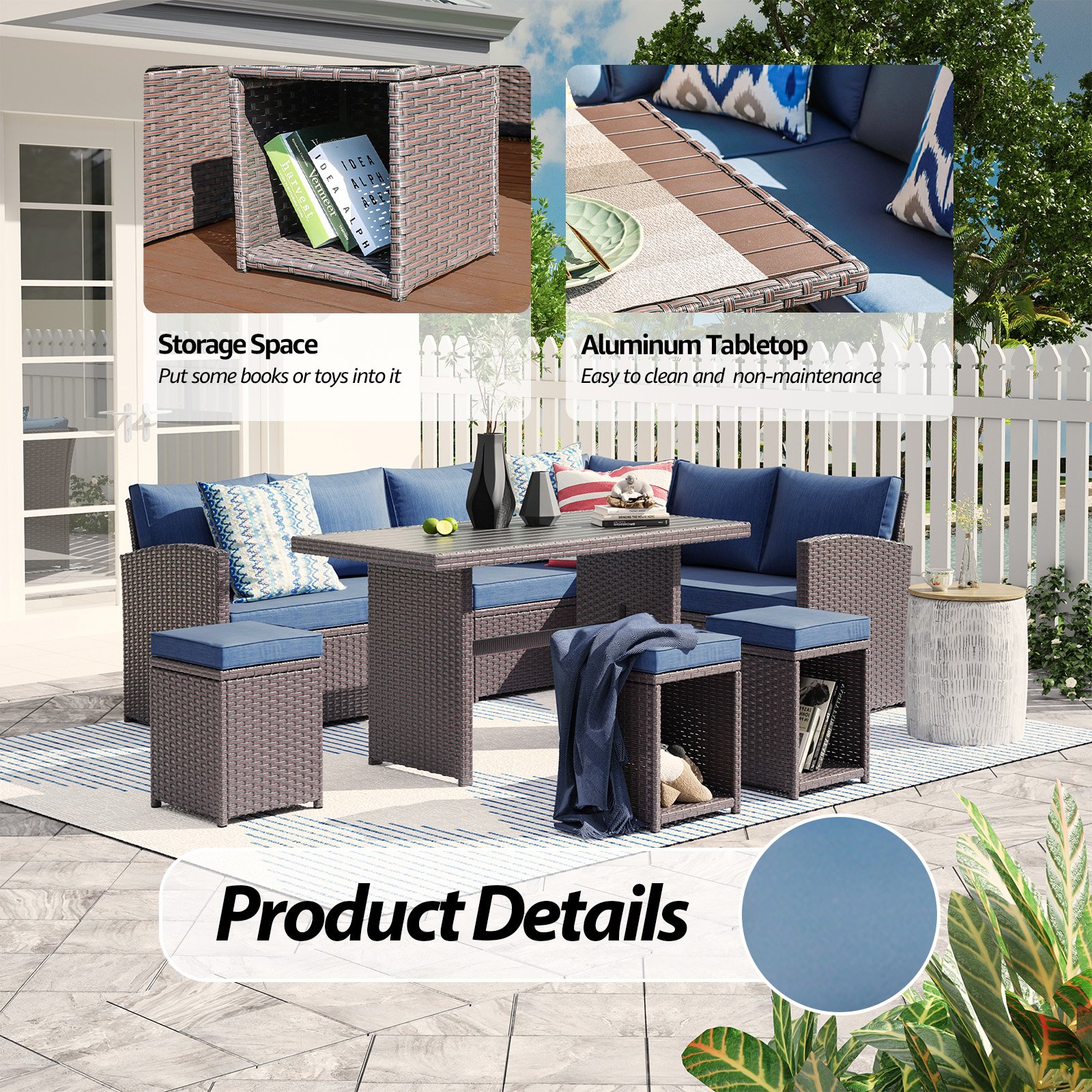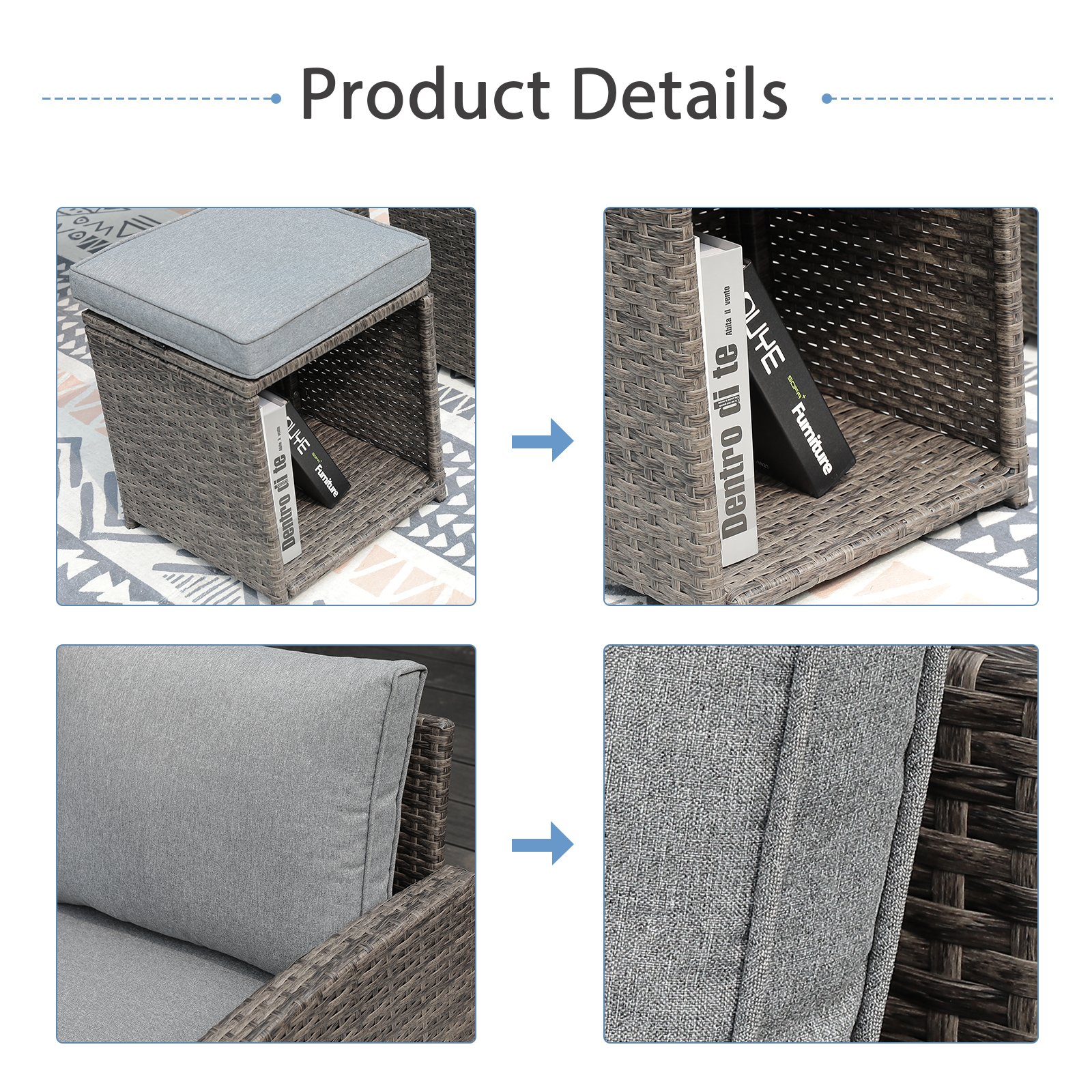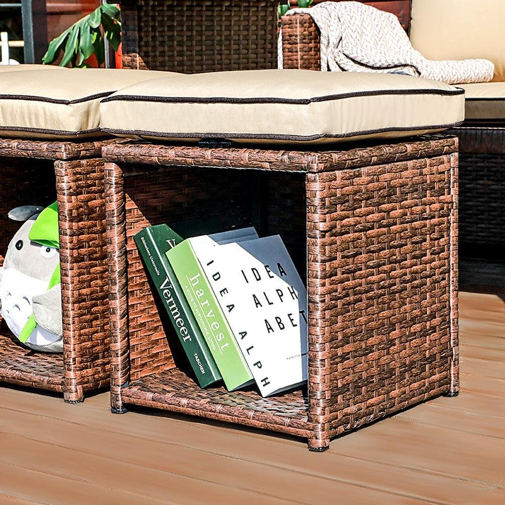 - User-Friendly Details The tabletop is made of aluminum, which makes the table lighter in weight for easy moving, yet keeping the function sturdy and crack-anti as well as rust-free. Also, the rattan wraps all sides of the tabletop for upgraded safety. Plus, the inner part of the patio ottomans provides extra storage space for toys or books