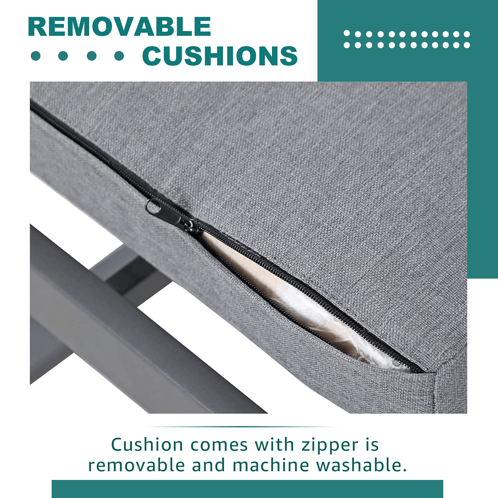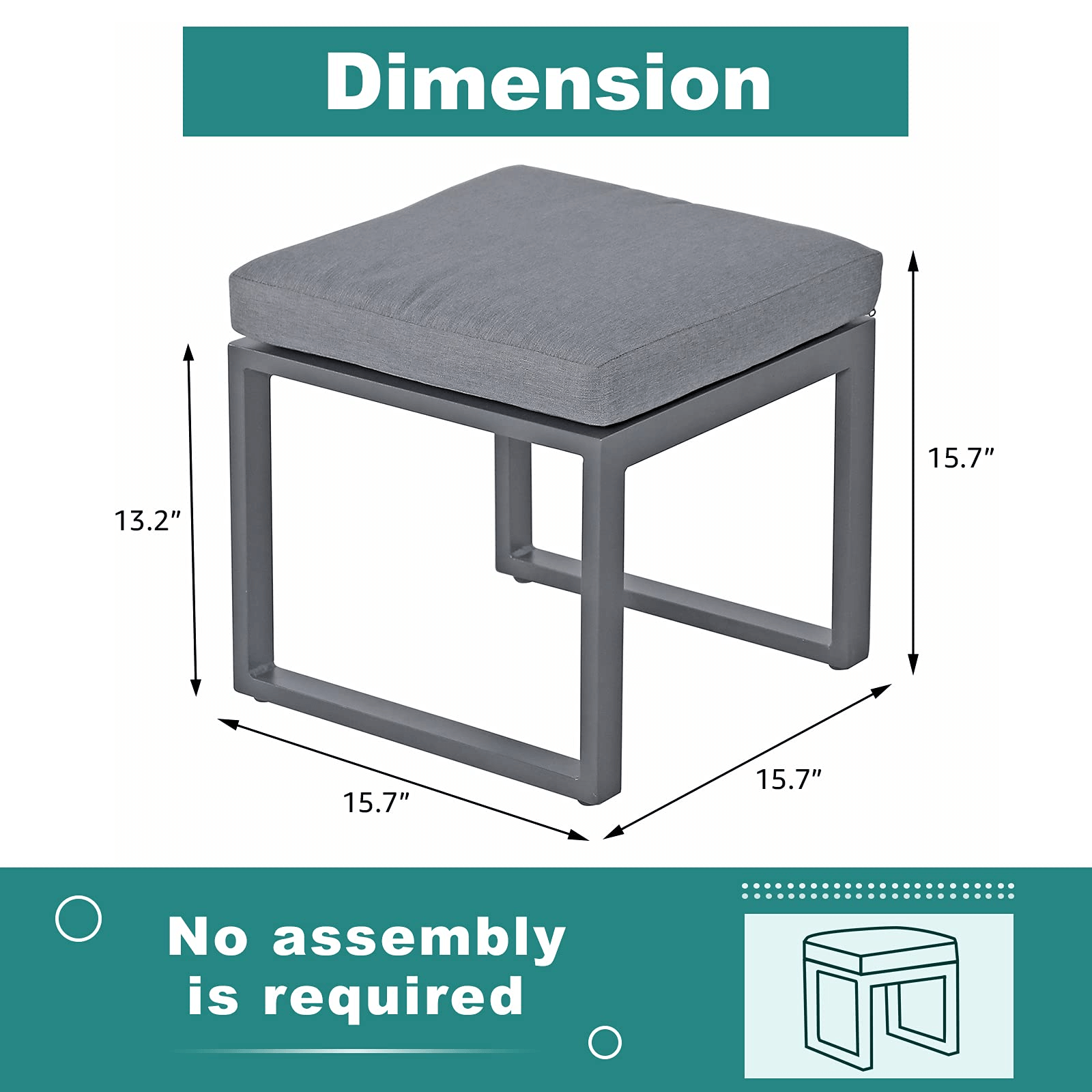 - DURABLE MATERIAL– Made of an all-weather-resistant aluminum frame, the square ottoman is lightweight but can hold a stable structure to ensure years of service life. Included seat cushions which are covered with olefin fabric have zippers for easy cleaning.