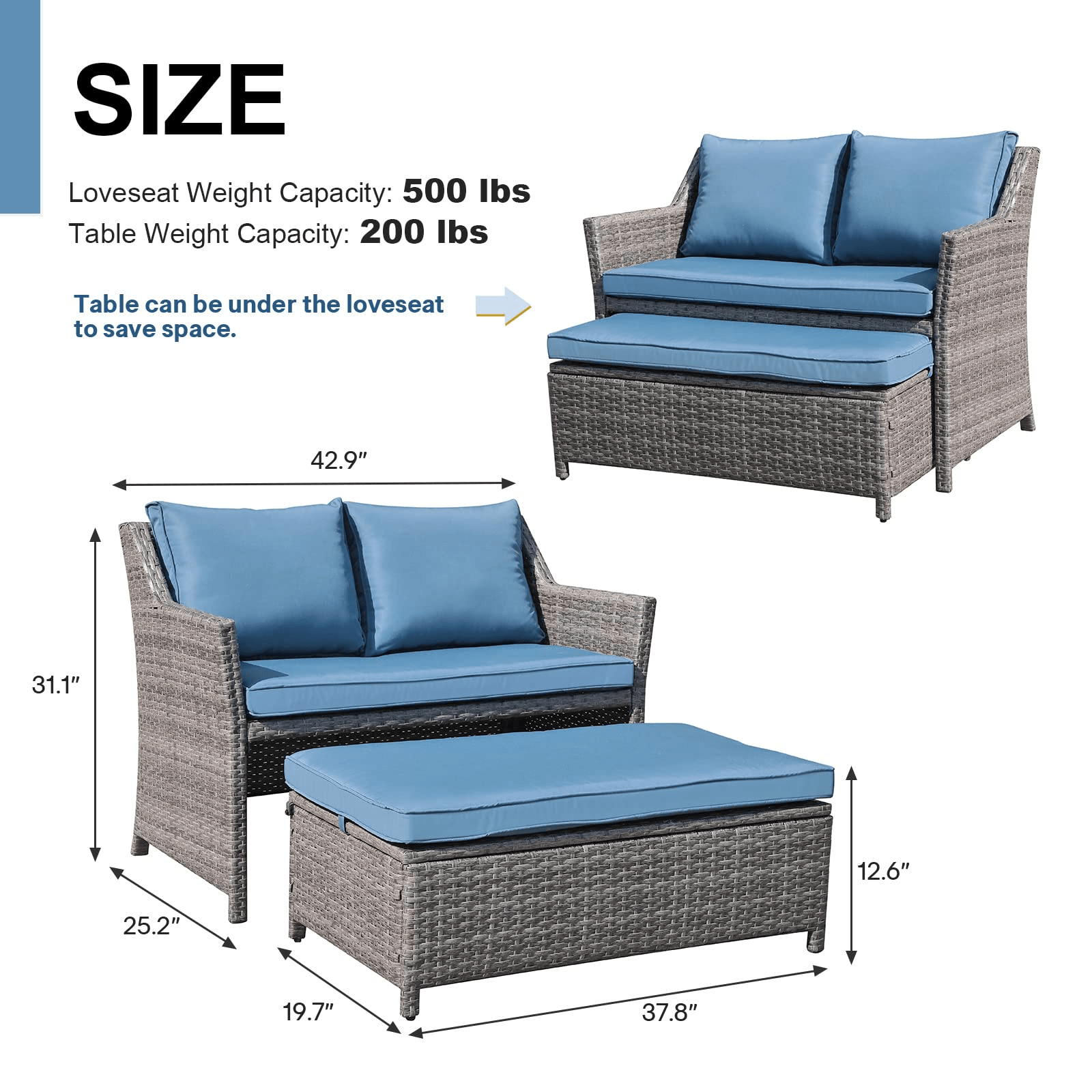 - Quick Assembly–Package Includes 1 x Loveseat;1 x Coffee Table; 2 x seat cushions and 2 x pillows. Assembly is easy with included clear instructions and necessary hardware.