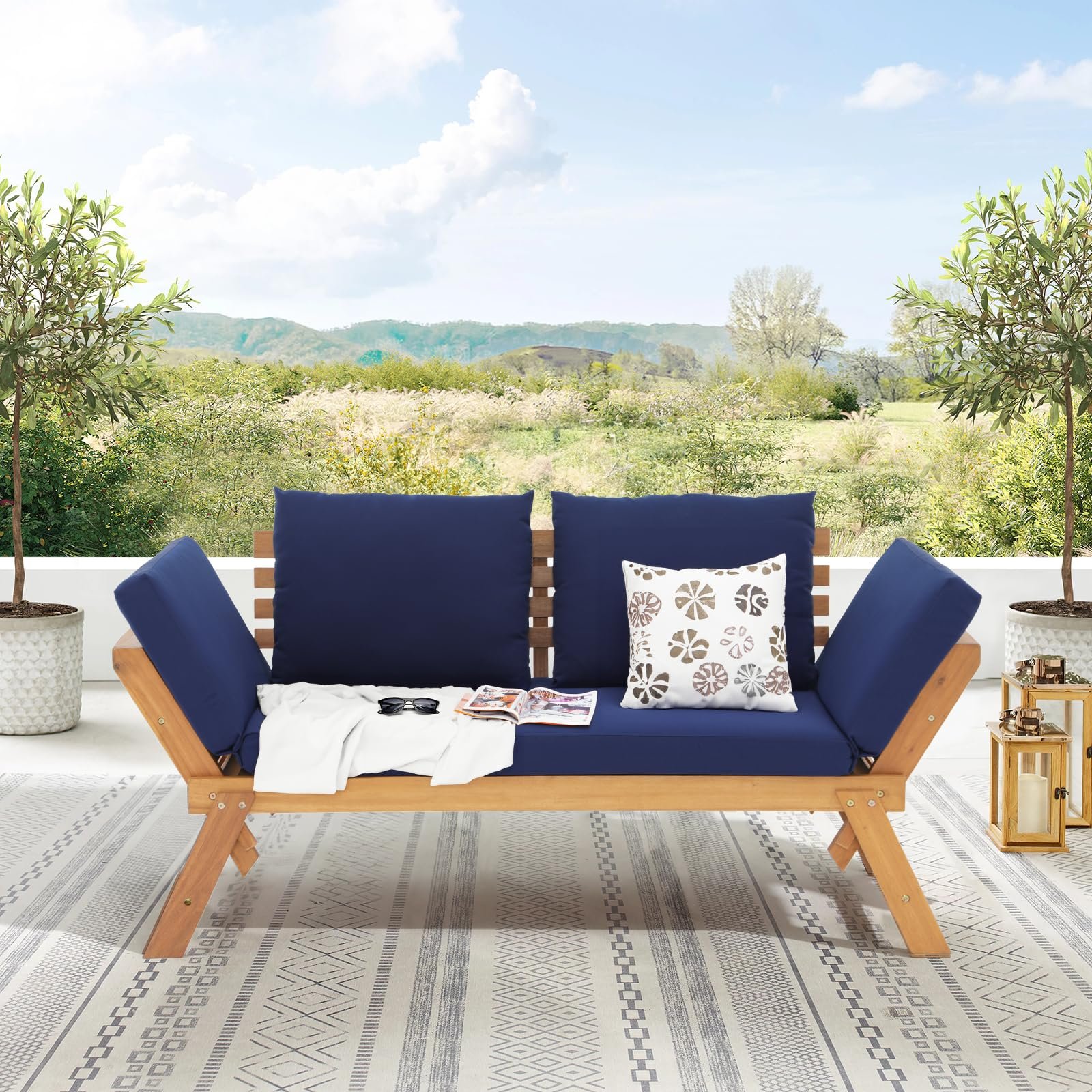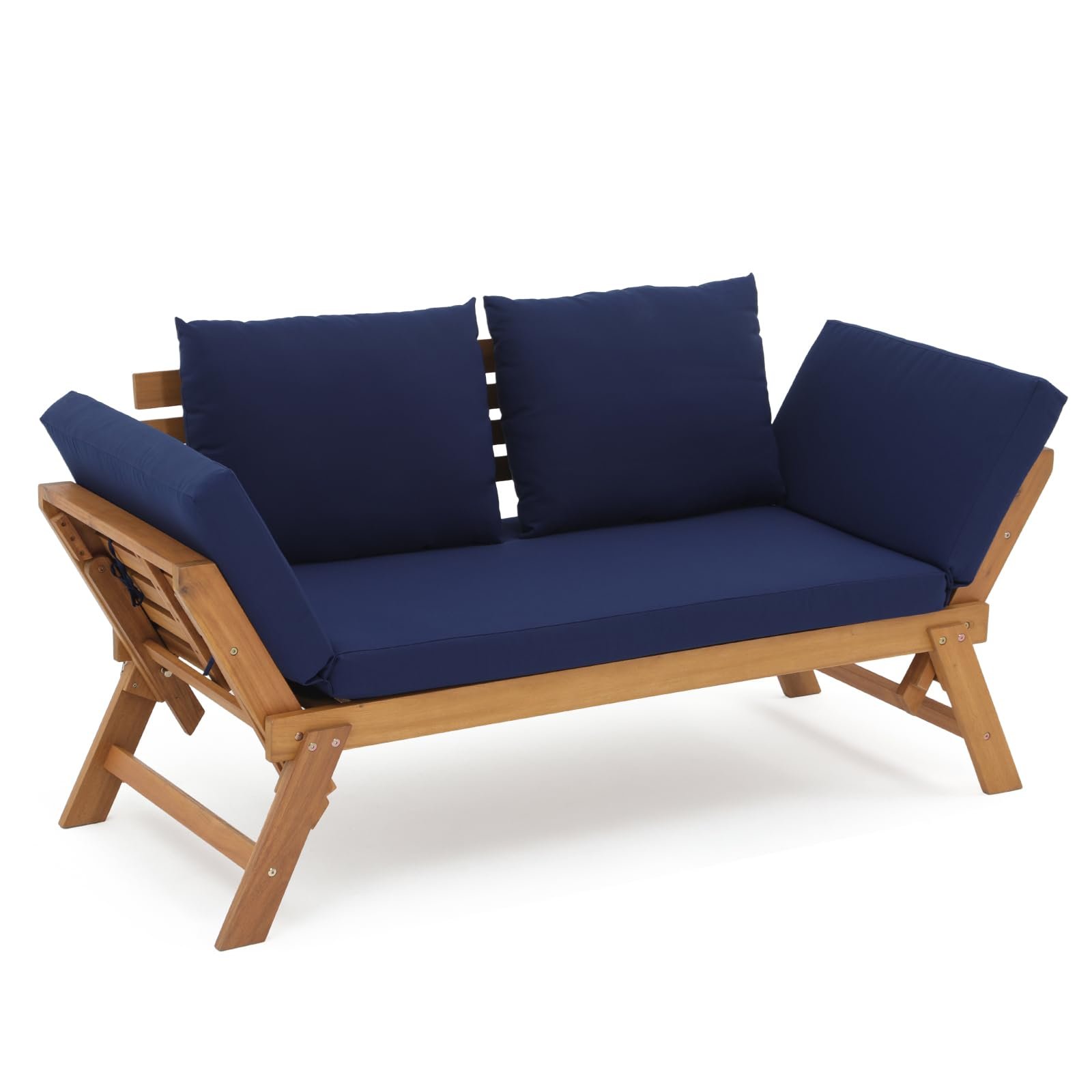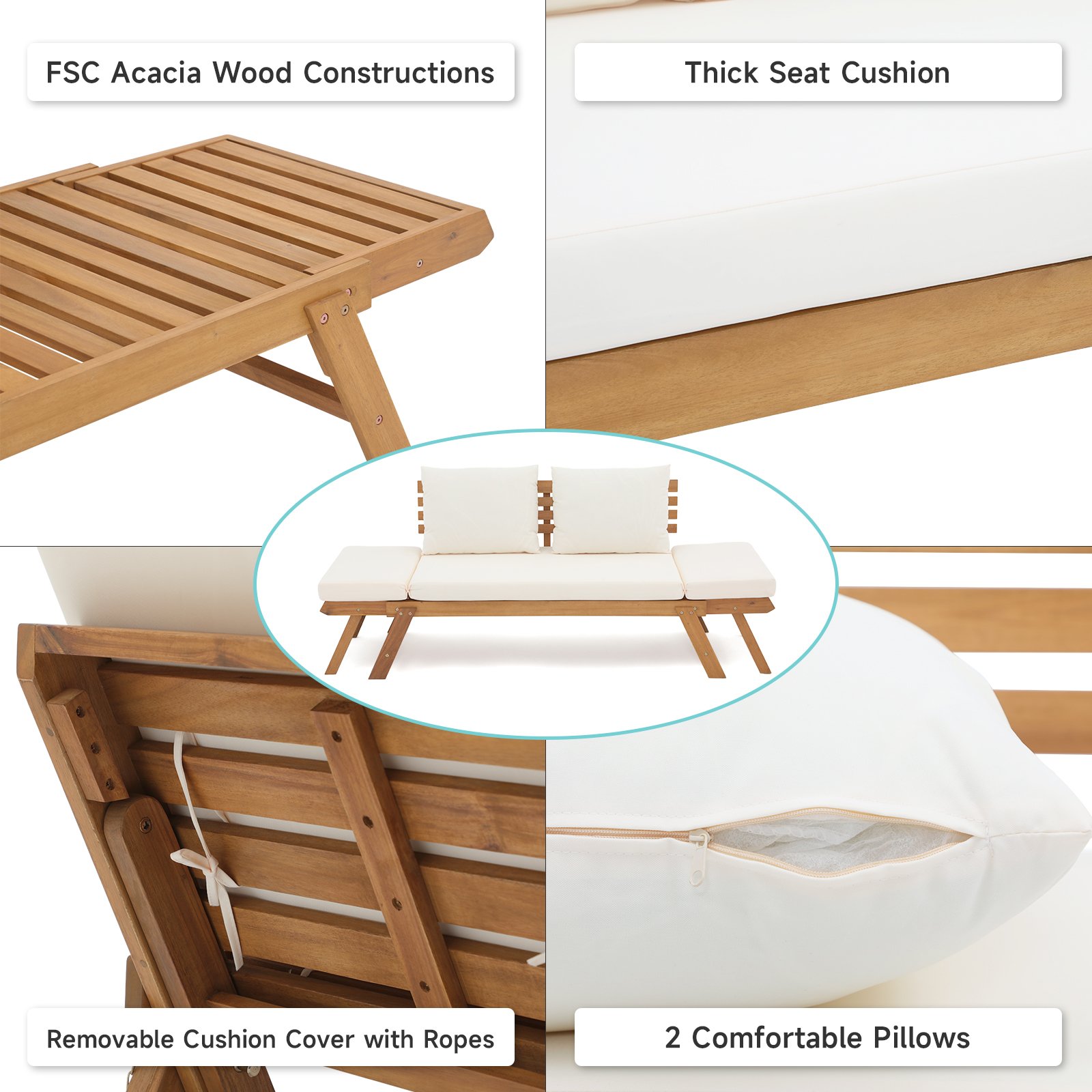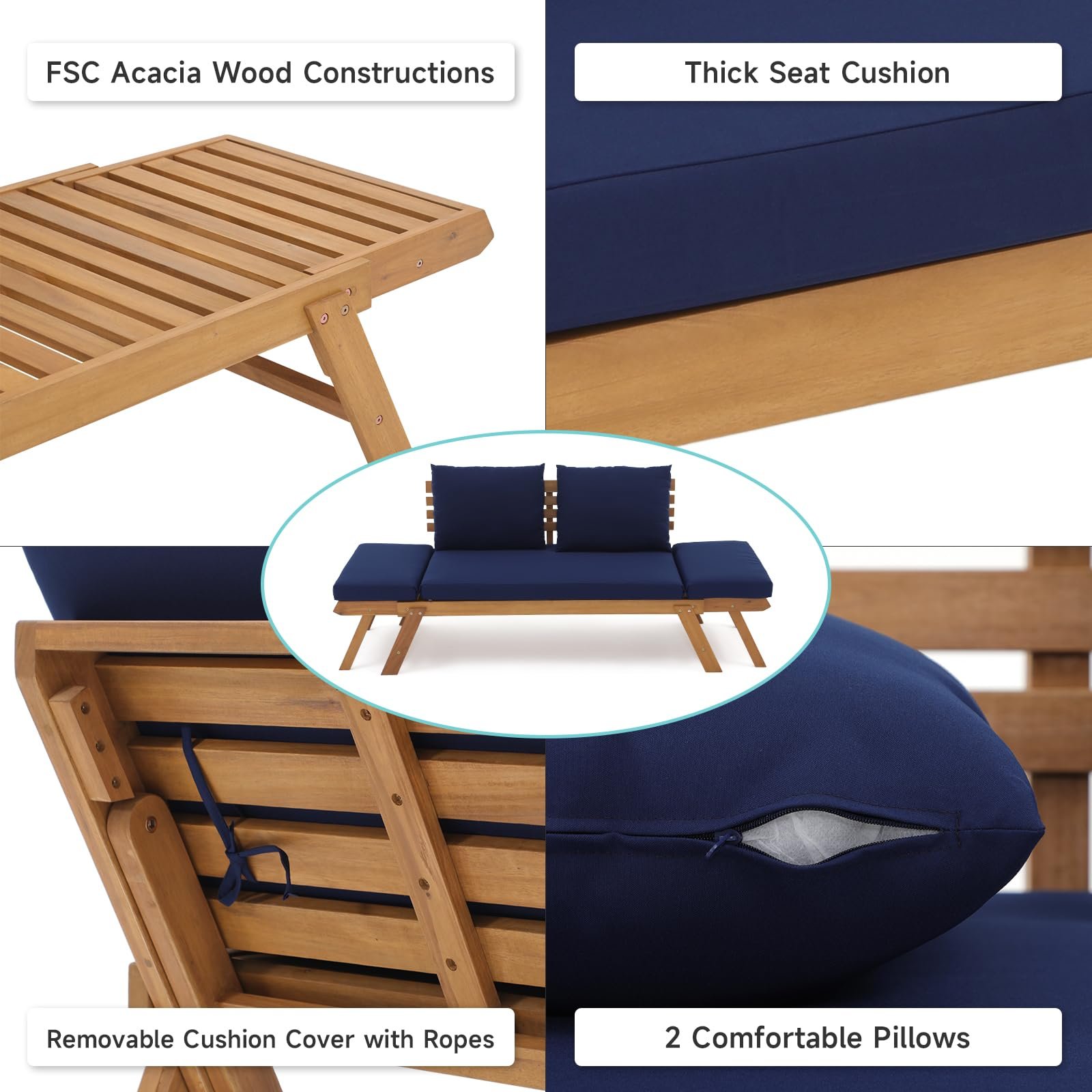 Outdoor Convertible Sofa Daybed, FSC Acacia Wood Patio Couch with Thick Cushion & Pillows