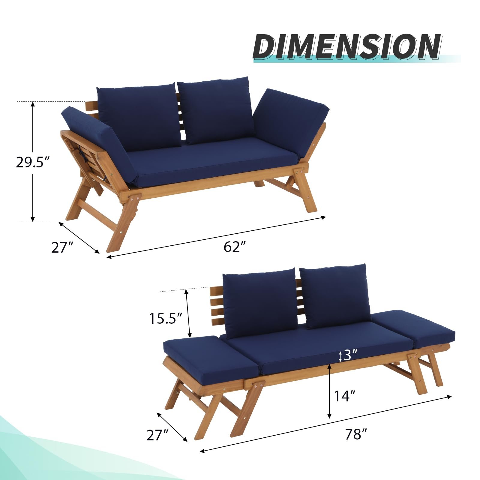 - Easy to Assemble-The convertible sofa and hardware package are included in 1 box, which is easy for you to assemble. Sofa dimension: 62” (L) X 27”(W) X 29.5”(H). Daybed dimension: 78” (L) X 27”(W) X 29.5”(H).