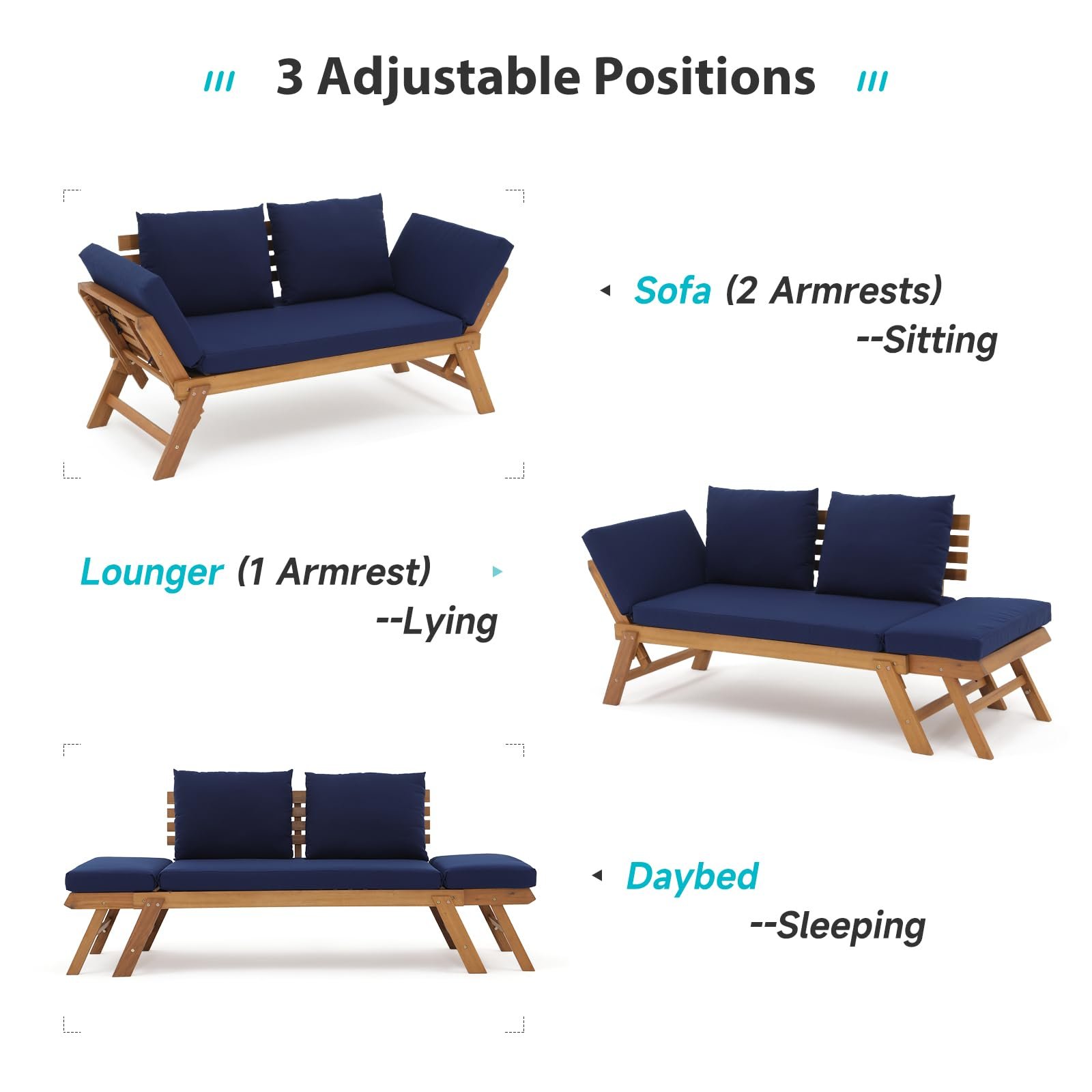 - 3 Adjustable Positions-This daybed has a convertible feature with 3 different adjustable positions. Armrests at both sides can be independently adjusted up or down to transform the furniture into a loveseat, a daybed or even a chaise lounge, which can adequately meet your seating, lounge or sleeping needsļ¼ perfect for outdoor summer chill or indoor use.